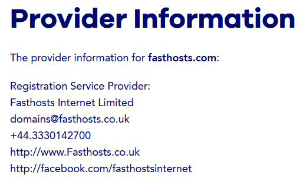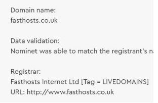 Checking who your domain name is registered with is simple. Using a WHOIS lookup, you can check your domains. If your domain is registered with Fasthosts it will be shown in either of the following formats: