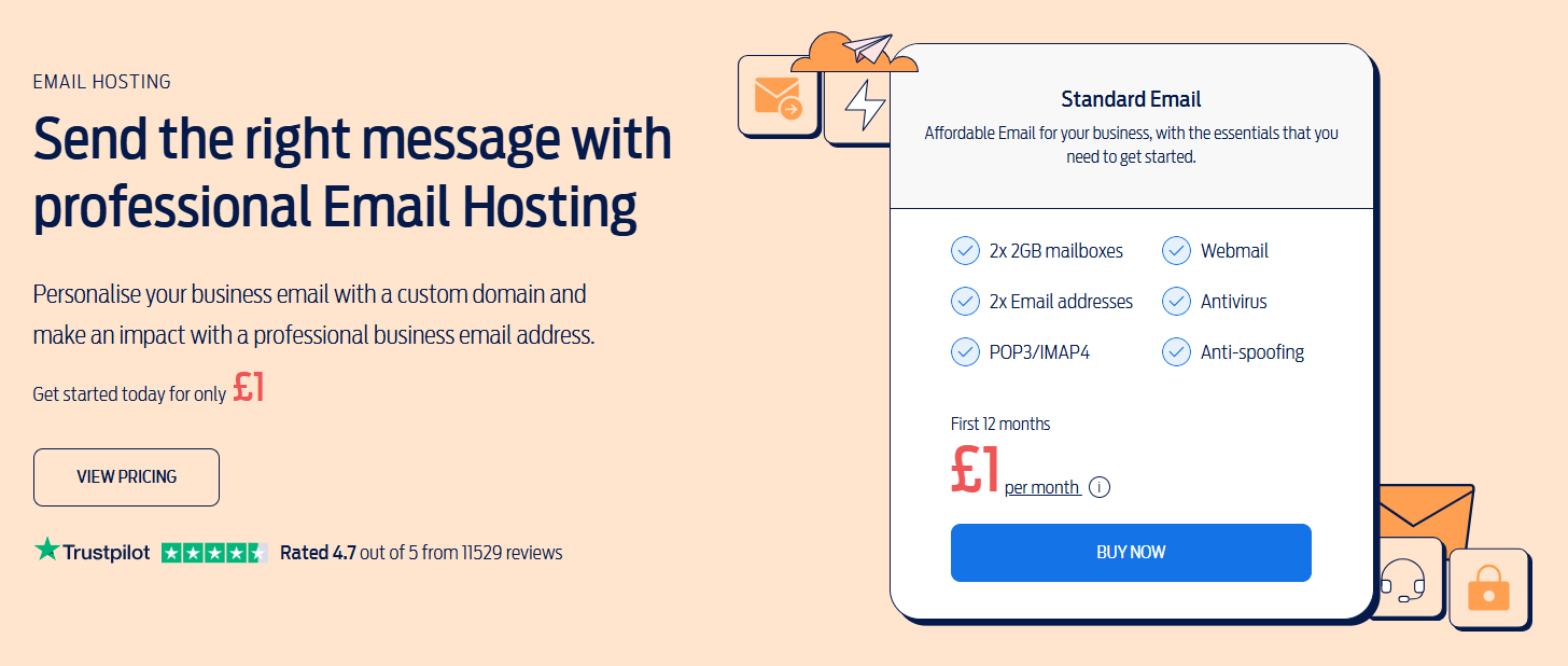 Hostinger provides one of the cheapest ways to host professional email, with large mailbox sizes up to 50GB and simple management tools ideal for small businesses or freelancers. With prices starting from just £0.59 per month per mailbox, Hostinger has quickly become a favourite among individuals and small businesses looking for affordable email hosting solutions.