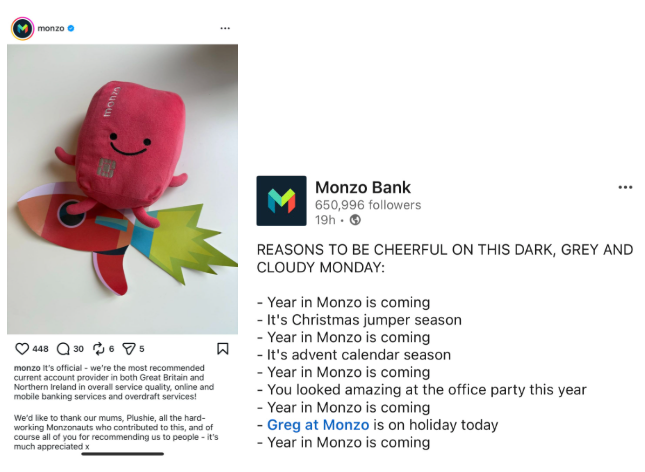 Monzo uses relatable jokes for their LinkedIn audience, and informative, but eye-catching content on their Instagram. Clarity on who and where your audience are in your strategy will make it much easier to grab their attention in practice.