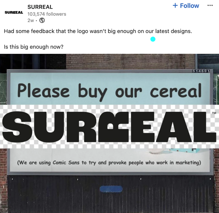 Surreal has been dubbed 'marketing for marketers' and we can see why. Their LinkedIn is full of marketing professionals praising their witty posts and large scale ad antics.