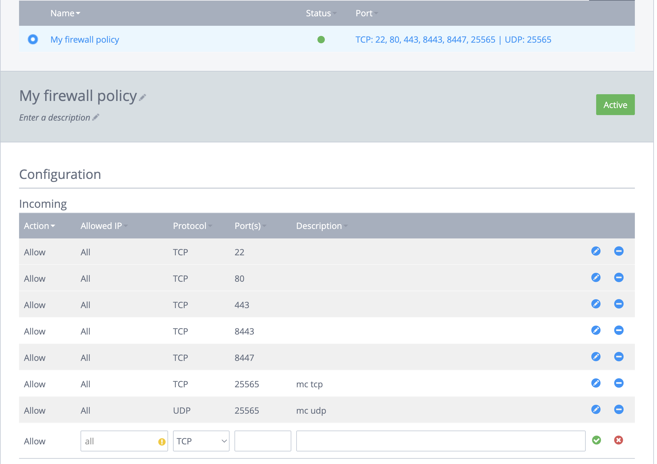 The last thing you need to do is check that the ports are now all open for the VPN so that it’ll all be able to connect nicely. For this, you need to head back to your server page in the Control Panel. Go to Firewall Policies under ‘Network’ in the menu on the left and open up the Firewall Policy on your server. You’ll then need to enter the Port number which was shown earlier on when you set up the VPN. If you didn’t make a note of this, don’t worry! You can go back to your terminal and scroll up to find it. It’s also worth noting that you need to make sure you select UDP as the protocol at this stage.