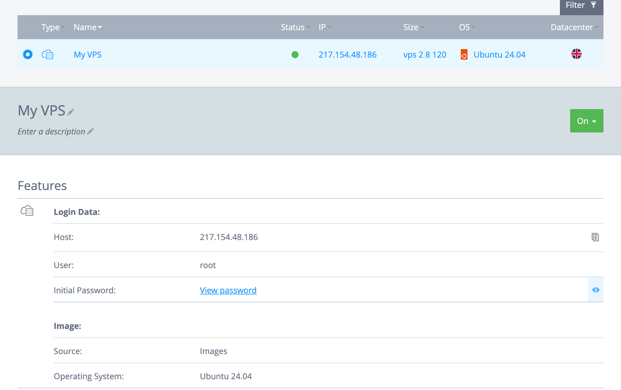 So now you need to look at the connection information for your VPS. Go to the VPS page of your control panel, as seen in the image above, and click on the name.
