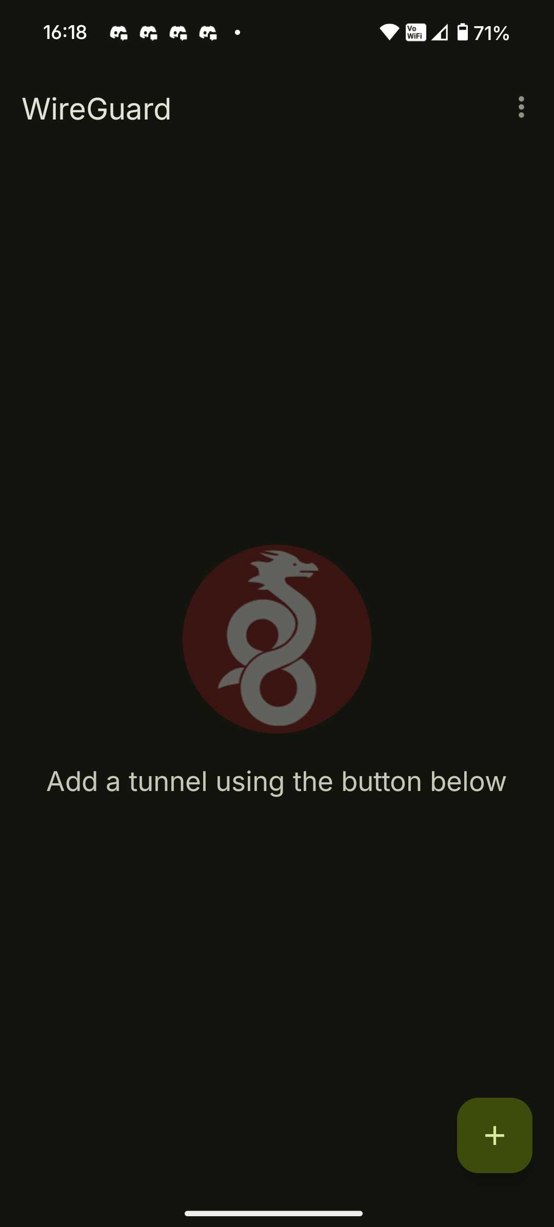 Head to the app store on your phone and install WireGuard. The first page you’ll see will be blank, with a plus symbol at the bottom. Here you can either scan the QR code or import the config file.