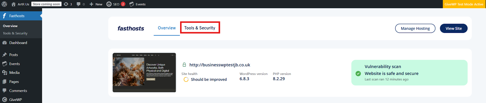- From the Fasthosts WordPress Dashboard, find and select ‘Tools & Security’.
