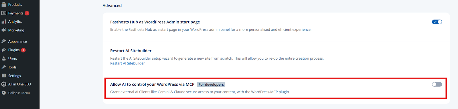 Normally, connecting an AI agent to WordPress via the MCP involves time, effort and knowledge – dealing with Node.js, local proxies, and API keys. We’ve taken that all away and replaced the manual plugin installation with a single ‘AI Connect’ toggle in your dashboard.