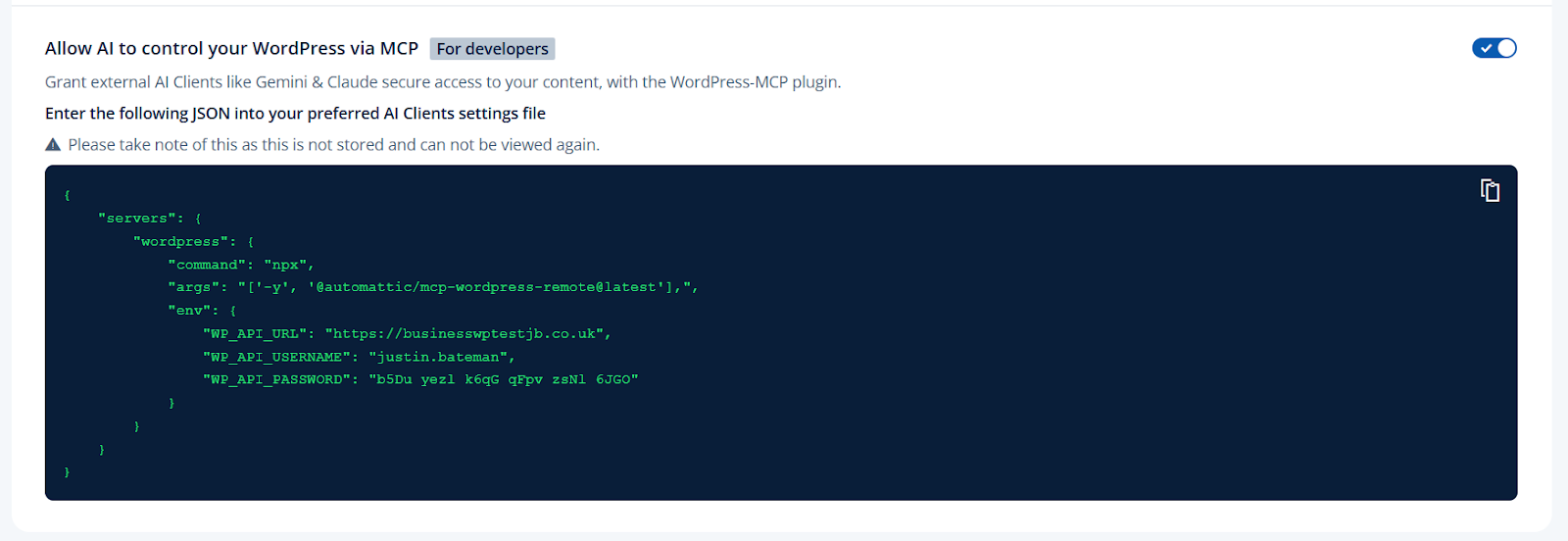 - You’ll then be prompted to ‘Generate an application password for user’. From here, you’ll be presented with a JSON snippet that you can copy and enter in the preferred AI Clients setting file.