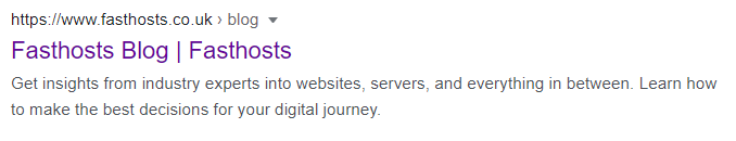Metadata is information that describes your web page, such as your title tag and description. A title tag is the ‘headline’ for your page, presented within a search results list. In the case below, the title is ‘Fasthosts Blog | Fasthosts’.