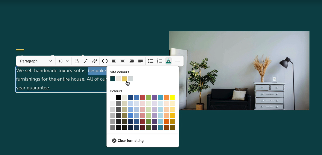 Another fun aesthetic update – you can now match the colour of your text to the theme of your website. Highlight the text you want to change, click on text colour and choose from any of your theme colours in the top bar. They’re clearly displayed, labelled and separated from the other colours.