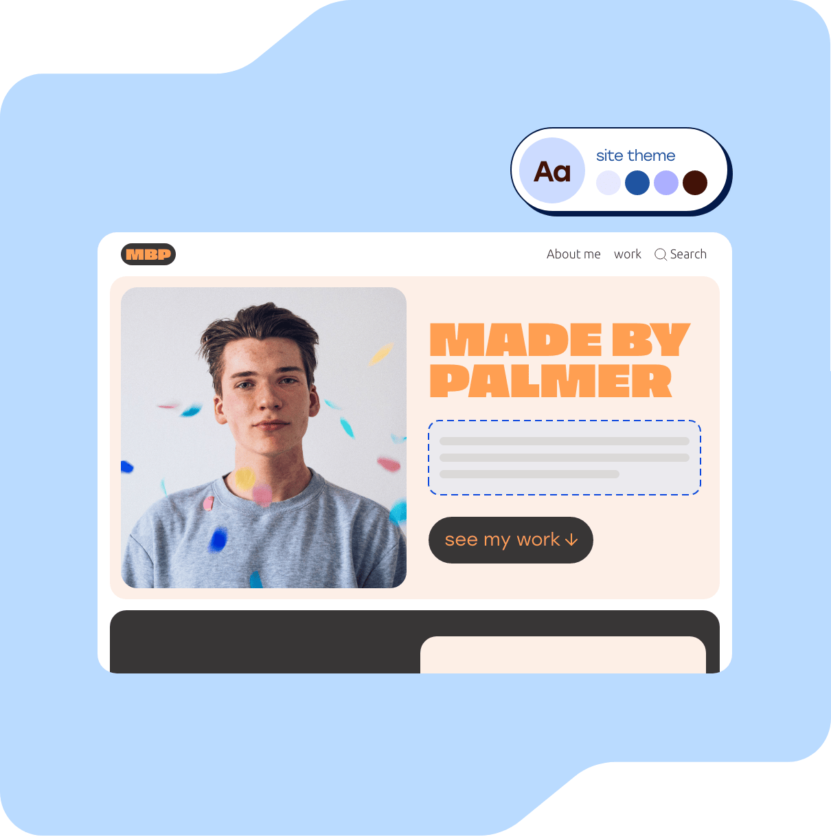 Faced with a blank page and not sure where to start? Tell our AI site creation tool a bit about you and your work, and watch a fully functioning site come together in seconds.